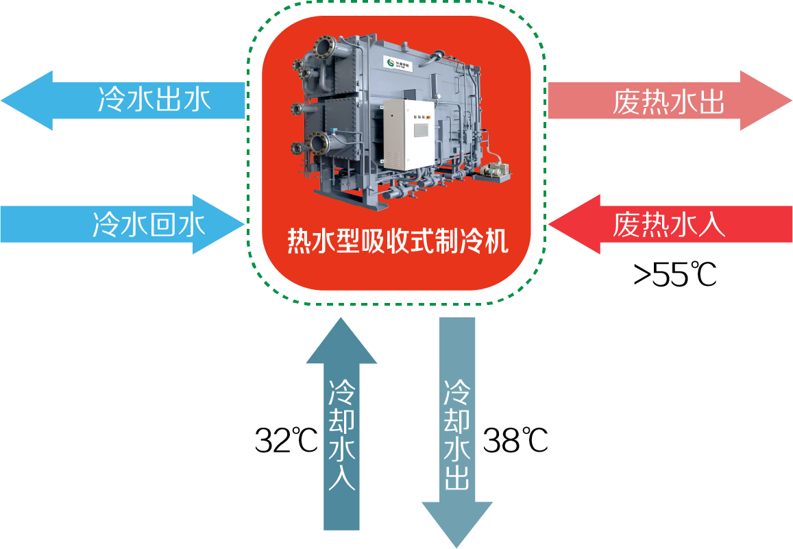 工業生產過程中,會產生大量的余熱與化學反應熱,這部分熱量排放到周圍的環境中,不僅造成大量能源的浪費,同時會對周邊環境造成嚴重的熱污染。而吸收式制冷技術可以充分利用排放的余熱與化學反應熱,制取冷水滿足工藝本身的用冷需求。有效提高系統能源的綜合利用率,降低生產成本,提高企業競爭力,達到節能、節水、減排的效果。