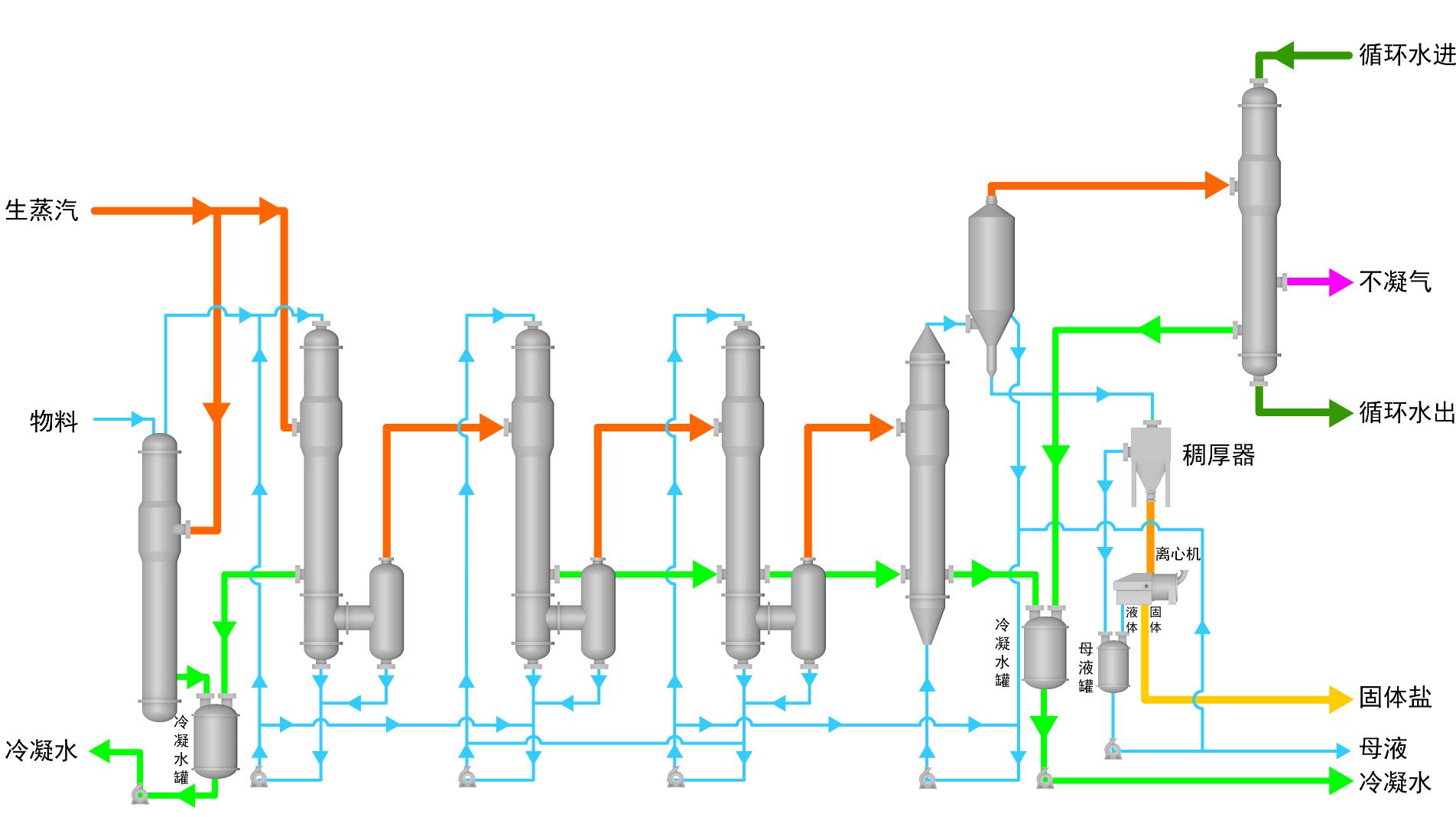 高能效:多效蒸發(fā)結(jié)晶產(chǎn)品可以實(shí)現(xiàn)多次利用蒸汽的熱能,大幅度降低能源消耗,節(jié)約成本。