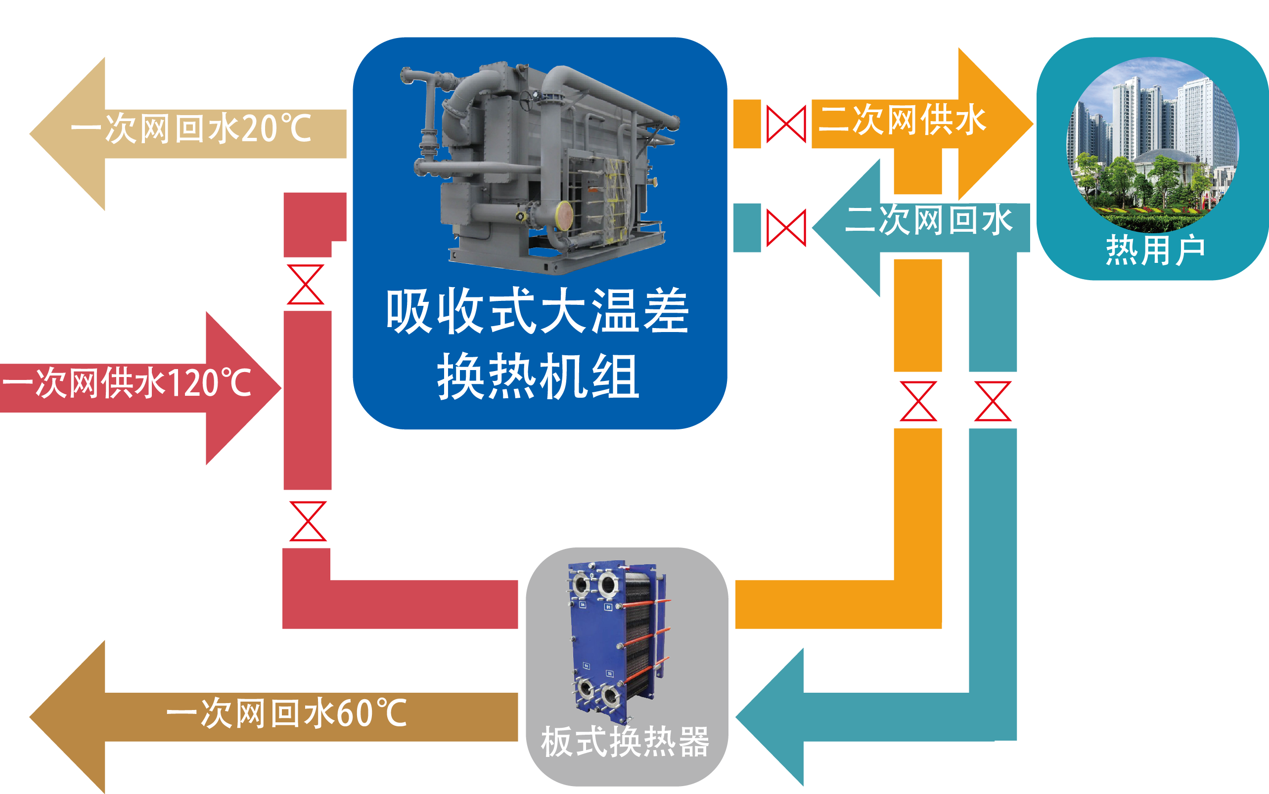 完整的吸收循環由基于吸收循環的超大溫差供熱技術和基于吸收式循環的余熱回收技術組成:在首站增設余熱回收專用機組回收凝氣余熱,解決熱源不足問題;同時在城市換熱站設置吸收式大溫差機組替代原有的板式換熱器,用于降低一次網回水溫度,拉大一次網供回水溫差,解決熱網輸送能力不夠問題。