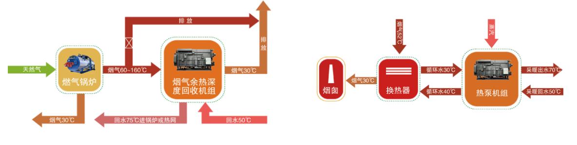 天然氣經(jīng)燃?xì)忮仩t燃燒后,產(chǎn)生的煙氣,進入煙氣余熱深度回收機組,深度回收煙氣中的熱量使排煙溫度大幅度降低,回收的熱量用于加熱熱網(wǎng)回水或直接供熱。