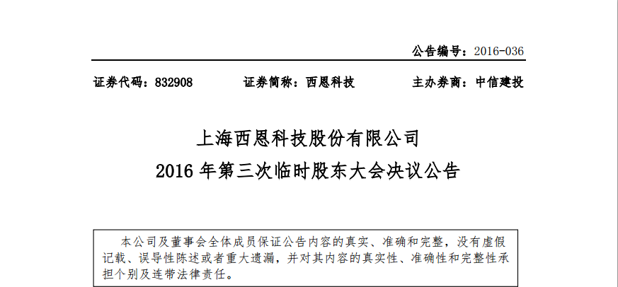 《上海西恩科技股份有限公司 2016 年第三次臨時(shí)股東大會(huì)決議》